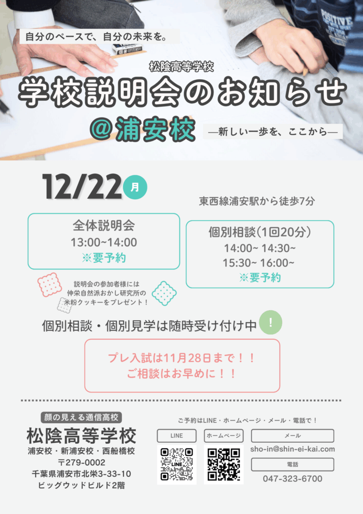 次回は12/22(月)13時から、浦安校で全体説明会と個別相談会を開催いたします。