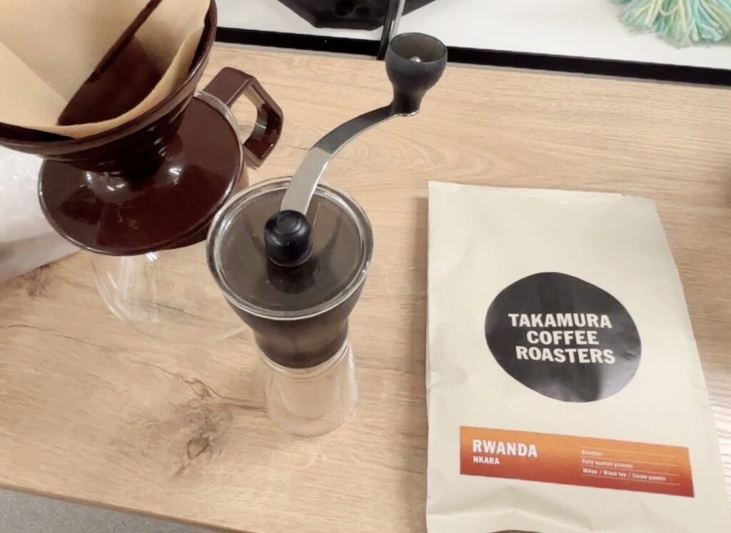 講座後には、ルワンダで栽培されているコーヒー豆を挽き、